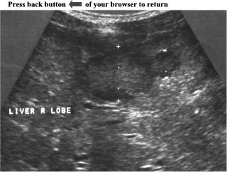 Ultrasound examination of the right liver lobe revealed two adjacent, hypoechoic, well defined masses. The size of the masses were 2,6cm and 1,3cm respectively. Both masses had hypoechoic halo around which made the masses easily distinguishable from surrounding liver parenchyma. The rest of the liver parenchyma was normal.